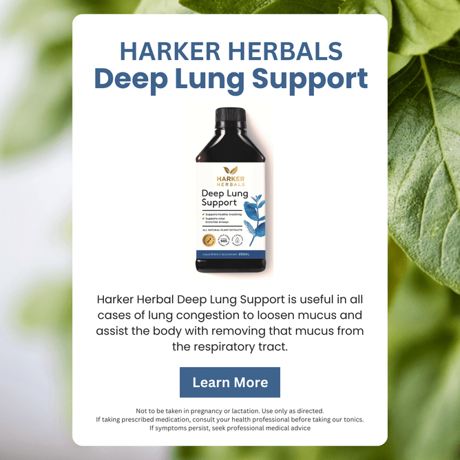 Powerful natural support to clear sticky mucus from the lungs and relax the chest for easy breathing. This potent herbal tonic combines more than 20 plant-based ingredients to soothe and settle the chest and lungs and support removal of stubborn mucus build-up. The herbs and plant oils thin mucus, making it easier to remove.  Includes peppermint and eucalyptus to support open airways. Deep Lung Support is Malcolm Harker's most famous lung tonic loved by generations of New Zealanders.